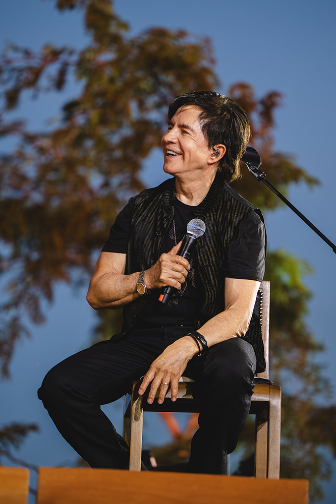 A cenografia traduz esse sentimento em imagem: um milharal ao fundo emoldura o palco e transforma o cenário em memória viva. É impossível não lembrar dos versos de “Meninos de Roça”, em que “esses meninos de roça sonhavam que o milharal eram milhões de pessoas e o cabo da enxada era o pedestal”. Ali, naquele tempo simples, a enxada virava microfone nas mãos de dois meninos sonhadores, e o milharal se enchia de aplausos imaginados.